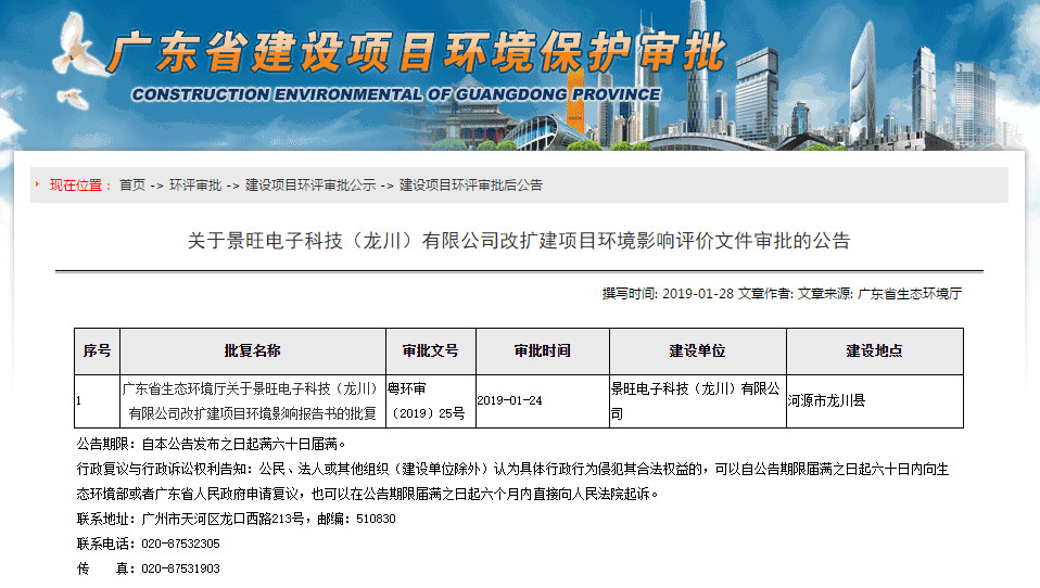 2019年1月28日,广东省生态环境厅发布了《关于景旺电子科技(龙川)有限公司改扩建项目环境影响评价文件审批的公告》(下称“公告”》。