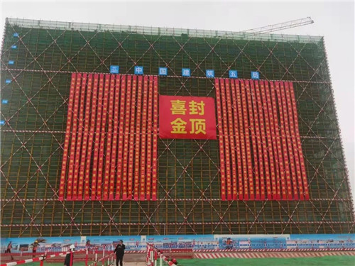 在一片欢快的锣鼓声中,各位领导及嘉宾步行前往封顶地点,进入喜封金口环节,伴随着封顶现场鼓乐齐鸣、礼花齐放,各位领导挥动手中的金锹,共同协作浇筑最后一方混凝土,封顶仪式达到了高潮。