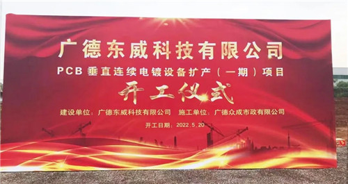 5月20日,广德东威科技有限公司(以下简称“广德东威”)PCB垂直连续电镀设备扩产(一期)项目开工仪式成功举行。昆山东威董事长刘建波、项目负责人等相关领导参加开工仪式。