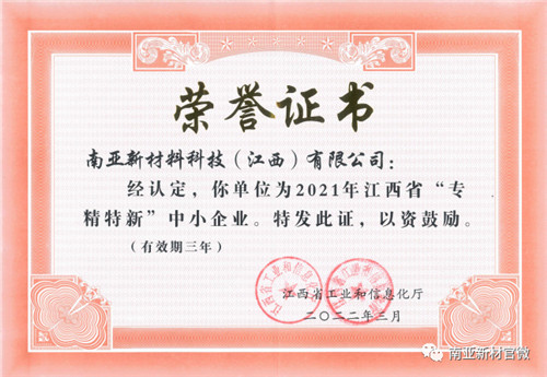 近日,江西省工业和信息化厅发布了《2021年江西省“专精特新”中小企业名单通知》,根据《江西省“专精特新”中小企业认定管理办法》等文件的通知要求,经组织推荐、审核和公示等程序,南亚新材料科技(江西)有限公司凭借在企业创新发展方面的突出成就顺利入选,于2022年3月喜获2021年度省级“专精特新”企业荣誉称号。