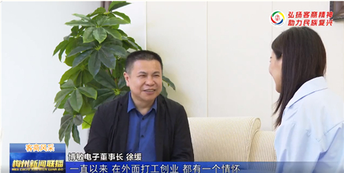 “弘扬客商精神、助力民族复兴”,第六届世界客商大会将于今年11月2日至4日在广东省梅州市举行。即日起,“梅州新闻联播”栏目推出《客商风采》系列专访节目,讲述知名客商的创业故事、奋斗历程,展现其情系桑梓的拳拳情怀和对家乡建设发展的孜孜努力,弘扬优秀客商精神,助力梅州苏区融湾先行区建设。今天推出第一篇:《博敏董事长徐缓:走千走万,不如梅江两岸》。
