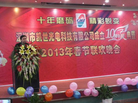 1月18日,以“十年磨砺 精彩蜕变”为主题的深圳市凯世光电科技有限公司成立10周年庆典暨2013年春节联欢晚会在坐落于神奇秀美的南海之滨的大梅沙海景酒店隆重举行。凯世深圳总公司、全国各分支机构的高层领导及130名员工集聚一堂,共襄盛举。SPCA、CPCA及平板协会等几家行业协会和媒体共同见证了这一辉煌时刻。