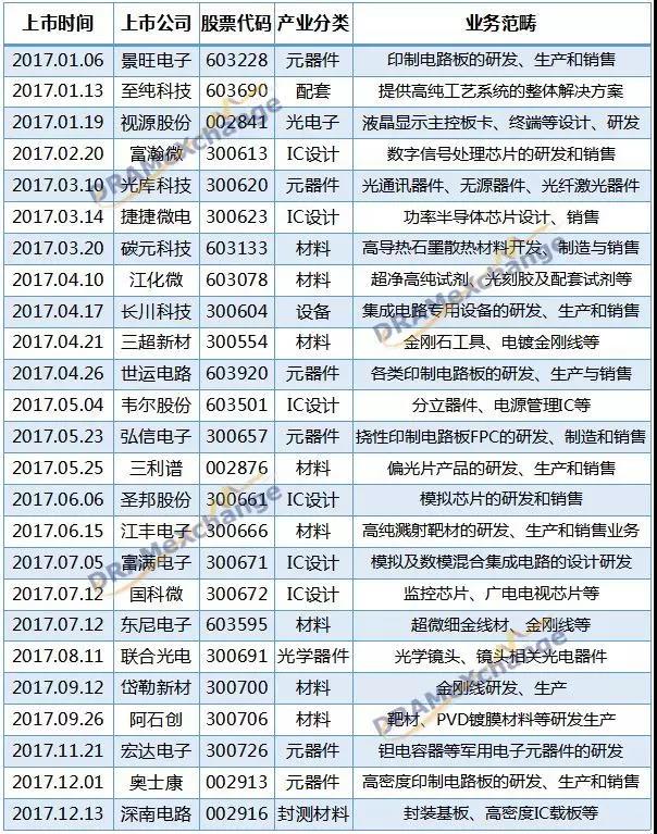 据集邦咨询不完全统计,截止目前,2017年总计有25家集成电路产业链企业在A股IPO,分别来自IC设计、材料、设备和电子元器件等细分领域。