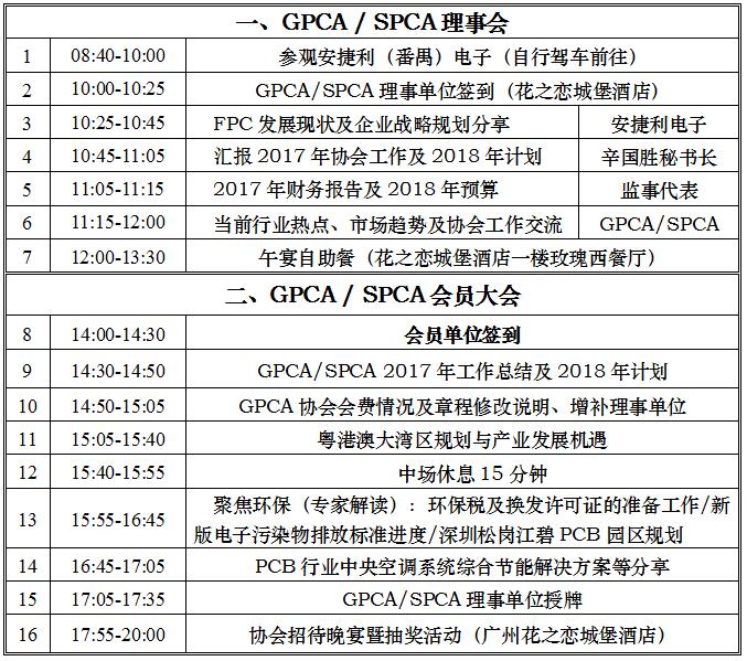 自2017年5月GPCA/SPCA换届之后,协会在新一届理事会领导班子的指导和带领下,进行了一系列卓有成效的工作,为总结这一阶段的工作,并为今后的协会发展指明方向,同时也是为加强各理事及会员单位之间的交流,持续推动协会工作的发展,拟定于2018年5月10日上午召开GPCA/SPCA理事会,并组织参观安捷利(番禺)电子实业有限公司;下午召开全体会员大会汇报工作、决议重大事项、探讨环保等热点议题,现将相关事项通知如下: