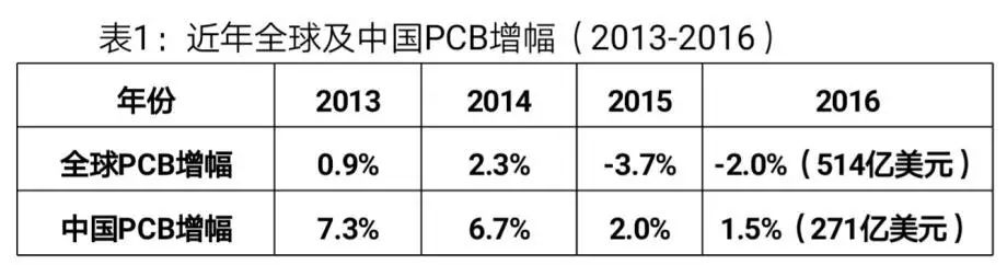 就是说,尽管中国PCB增幅从两位数变成一位数,变到微增长,但中国PCB的表现是世界各国/地区中最好的。中国PCB占全球产值的比例,从2015年的48.3%上升到2016年的50.0%,简言之,全球PCB有一半是中国生产的。近年来全球电子产业低迷的总体形势下,中国PCB逆世界潮流,仍在增长,占全球比例仍在扩大,说明中国PCB行业的发展在世界同行中是稳妥健康的。