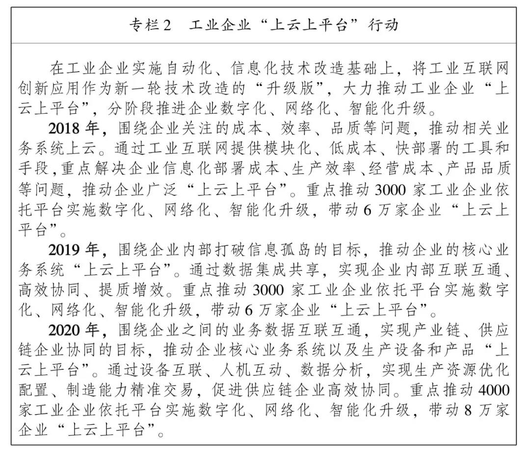 推动1万家工业企业运用工业互联网新技术、新模式实施数字化、网络化、智能化升级,带动20万家企业“上云上平台”,进一步降低信息化构建成本。初步建立工业互联网安全保障体系。