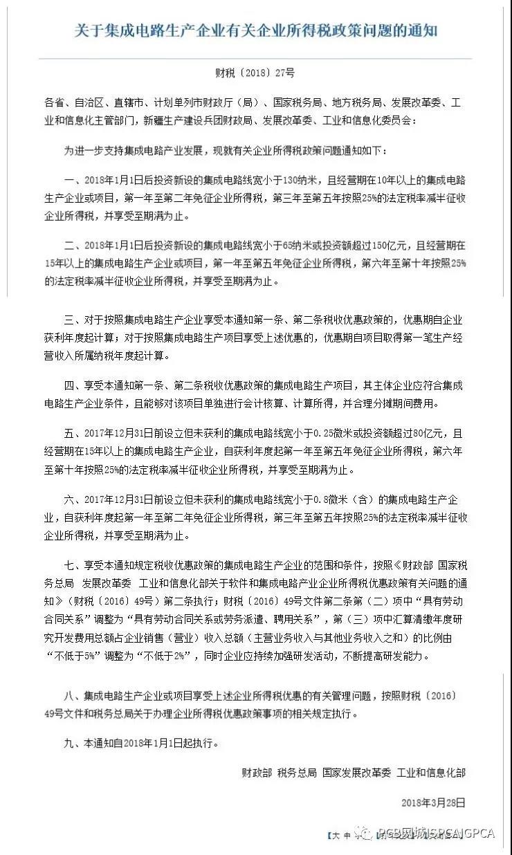 2018年3月28日,财政部等四部门发布《关于集成电路生产企业有关企业所得税政策》。《政策》提出2018年1月1日后投资新设的集成电路线宽小于130纳米,且经营期在10年以上的集成电路生产企业或项目,第一年至第二年免征企业所得税,第三年至第五年按照25%的法定税率减半征收企业所得税,并享受至期满为止等要求。