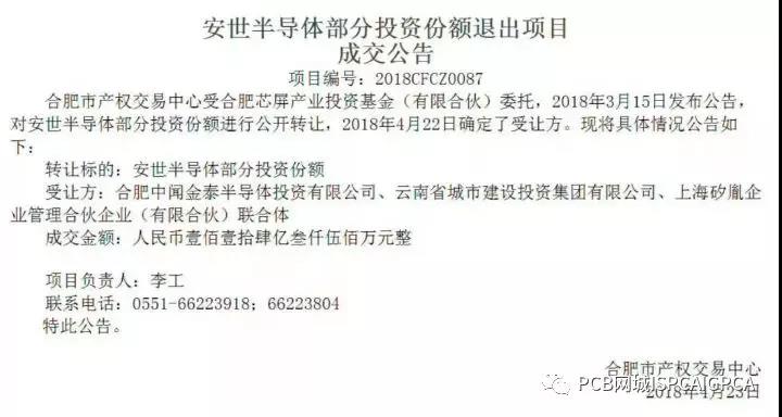 4月23日,合肥市产权交易中心发布了一则公告,内容显示,安世半导体(Nexperia)部分股权进行公开转让,已于22日确定转让给合肥中闻金泰半导体投资有限公司等联合体。