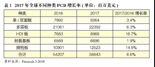 与2016年相比,2017年的单/双面线路板产值增加3.4%,多层板产值增加6.3%,HDI板产值增加16.7%,封装基板从2011年开始一路往下走就没停过,原以为可能会拖到2018年、2019年,结果没想到跑出个比特币,瞬间拉上去了,所以封装基板产值增加1.9%,让人很意外,封装基板一方面是市场需求影响,另一方面产品技术的改变;同时挠性线路板产值增加14.9%。增幅最大的是HDI板,增幅最小的是封装基板,2017年全球不同种类PCB增长率见表1。