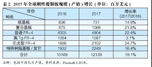 2018年3月,Prismark公司姜旭高博士在上海CPCA春季论坛会上做了《全球PCB市场的挑战与展望》的演讲,该公司的统计结果表明,2017年全球PCB总产值588.43亿美元,相对于2016年PCB总产值542.07亿美元,增长了8.6%。而对于线路板的主要原材料——刚性覆铜板而言,2017年全球刚性覆铜板市场,由2016年的101.89亿美元,增加到2017年的121.39亿美元,年增长率为19.1%。以下主要依据2018年6月Prismark公司发布的刚性覆铜板市场数据进行分析。