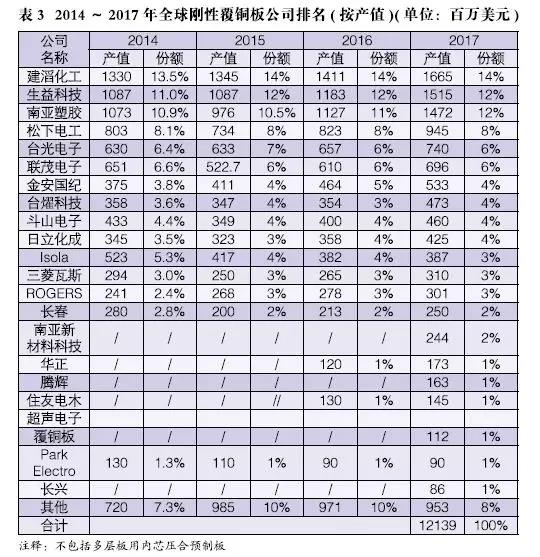 Prismark公司分别调查统计了不同公司在2017年刚性覆铜板的产值的排名,从表3中更可以清晰地看出2014~2017年全球刚性覆铜板公司排名的变化情况。建滔化工集团以16.65亿美元继续排名全球第一,占全球份额为14%;生益科技以15.15亿美元排名全球第二;南亚塑胶以14.72亿美元排名全球第三;松下电工以9.45亿美元排名全球第四;台光电子以7.40亿美元排名全球第五;联茂电子以6.96亿美元排名全球第六;金安国纪以5.33亿美元排名全球第七。同时,中国大陆覆铜板企业金安国纪和南亚新材料科技、浙江华正均已继续进入排行榜。