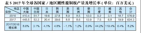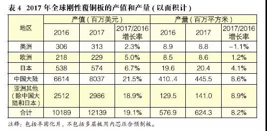 从表4可以看出,中国大陆2017年刚性覆铜板的产值增加了21.5%,其面积增加了8.6%。其中,2017年全球各国家/地区刚性覆铜板产量(以面积计)及增长率,见表5。
