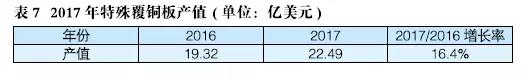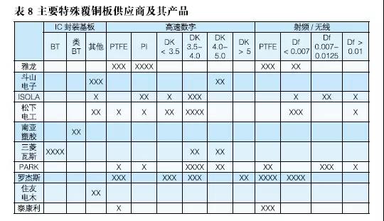 2017年全球特殊覆铜板(包括少量的其它品种覆铜板)产值为22.49亿美元,比2016年增加16.4%,见表7,主要特殊覆铜板供应商及其产品见表8。