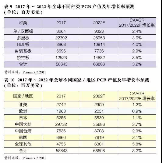 汽车电子、绿色基站等电子终端的兴起等都将对PCB产生强大的拉动作用,促进PCB行业的增长。Prismark在2018年3月的报告中预测未来5年,HDI板将保持优先的复合增长率,其他品种线路板也有较大的增长,见表9。亚洲将进一步成为全球线路板的主产区,中国大陆将占据全球半壁江山,见表10。今年第一季度,我国大陆地区覆铜板进出口比去年同期都有所增长,出口量比上年同期增加3.72%、进口量比上年同期增加9.81%,详见表11。