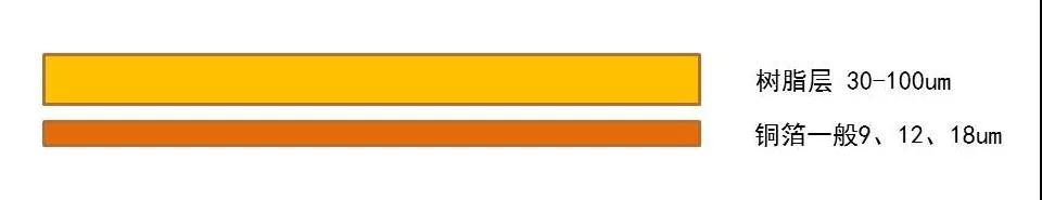 定义:RCC是在极薄的电解铜箔(厚度一般不超过18um)的粗化面上精密涂覆上一层或两层特殊的环氧树脂或其他高性能树脂(树脂厚度一般60-80um),经烘烤箱干燥脱去溶剂,树脂半固化片达到B阶段形成的(结构图如下):