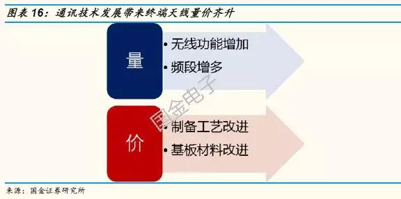 通讯技术快速发展,终端天线量价齐升。随着通讯技术的不断发展,智能手机的无线功能不断增加,频段增多,带动了单机天线数量的增多。同时,传输升级,频率升高,天线的设计要求提升,为了实现无线信号快速且高效的传输,天线的制备工艺和材料不断改进,提升了单一天线的价值量。