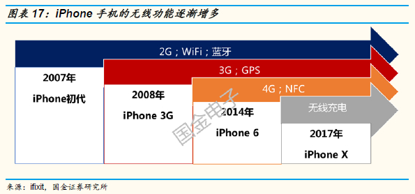 无线功能增加:初代iPhone的无线功能仅包含移动网络、WiFi和蓝牙,具备通话和无线上网功能。为了实现无线定位功能,iPhone 3GS增加了GPS天线;为了实现无线支付功能,iPhone 6则新增了NFC天线,新出的iPhone X更是增加了无线充电功能。