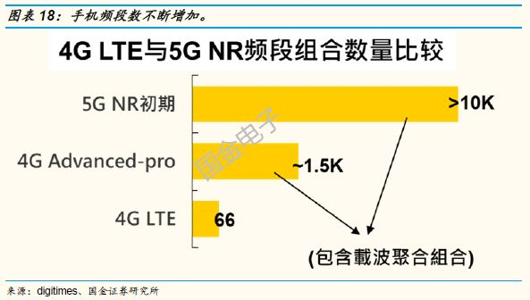 应用频段增加:蜂窝网络由单模到多模多频,到全网通和全球通;WiFi天线也从单频发展到双频模式,以及载波聚合的推广,至2018年6月,3GPP定义的4G LTE频段已达66个,加上载波聚合的频段组合数量超过1500个,应用频率的增加带动了对应天线数量的增加。5G频段数将迎来更大的增长。