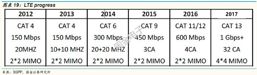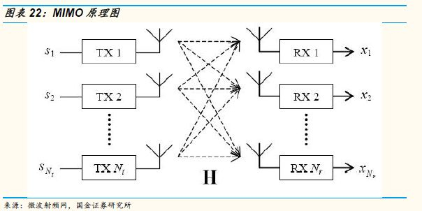 接收分集和MIMO技术提升智能手机天线数量。MIMO技术的升级直接增加天线数量,从最早的单天线收发(一根蜂窝天线)一根天线,到接收分集的1TR2(两根蜂窝天线),到2*2MIMO(两根蜂窝天线),到4*4 MIMO(四根主天线)。