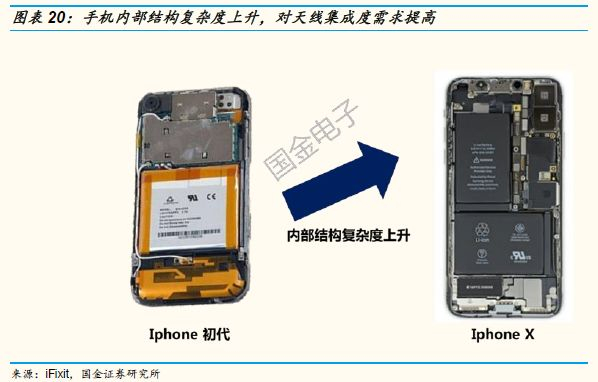 手机内部空间压缩,天线数量增多,高度集成+轻薄,设计难度增加,带动天线价值量提升。智能手机功能的增加,一方面使得手机内部功能模块数量增多,另一方面增加了手机的耗电量,电池体积提升,严重压缩了手机内部的空间,iPhone X的结构跟iPhone初代相比已经非常拥挤。全面屏设计更是进一步压缩了为天线预留的净空区域,天线的集成度需求不断提高,使得设计难度增加,带动天线价值量提升。