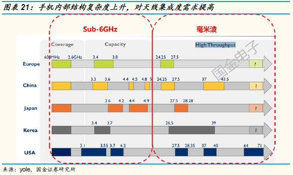 预期5G商用初期,智能型手机仍将以支持Sub-6GHz频段为主,5G毫米波手机则可能由电信营运商客制新的款式,并仅在特定市场销售,2021年以后放量增长。在营运商网络部署初期,28GHz的毫米波手机难有实质使用效益,加上成本与体积问题依旧存在, 5G智能型手机前期将以支持Sub-6GHz频段为主。