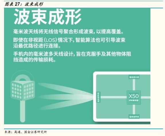 支持波束成形、波束导向和波束追踪技术应对毫米波三大难题。毫米波通信有三大难点:①全向发射时,能量发散比较快,传输距离有限;②米波频谱容易被楼宇、人体等阻挡、反射和折射;③毫米波受限于很多空间因素,比如水分子等。高通推出的QTM052毫米波天线模组,可与骁龙X50 5G调制解调器协同工作并形成完整系统,可支持波束成形 、波束导向和波束追踪技术,从而显著改善毫米波信号的覆盖范围及可靠性。