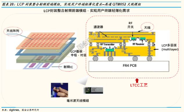 毫米波天线需要新的加工工艺:可分为线阵、方阵。天线尺寸跟工作频率成反比,毫米波的频率变高,天线尺寸变小,简单的加工形式精度不够,还得借助于其他的加工形式,如高通毫米波天线模块采用的LTCC工艺。
