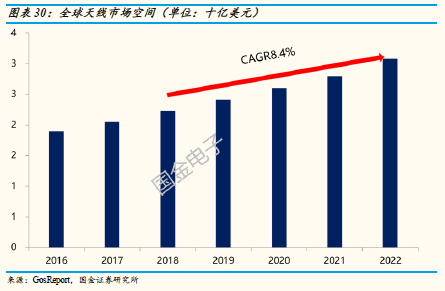 据预测,天线市场空间将由2018年的22.3 亿美元增加到2022年的30.8 亿美元,复合增速8.4%。随着后面毫米波手机的放量,天线行业将迎来更大的增长。