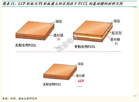 LCP(Liquid-crystal polymers)是一种液晶体聚合物,LCP软板是以LCP为基板做成的,而普通的软板用PI做的基板;除此之外,普通的FCCL需要黏胶将基板和铜箔粘合起来,而LCP则是直接和铜箔热压粘合,因此可以做得更薄。