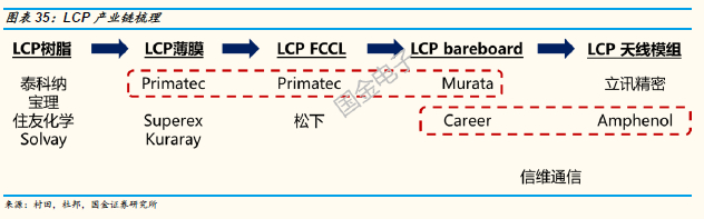 LCP薄膜:加工制成技术门槛高。Superex(美国)、Kuraray(日本)、Primatec/村田(日本)等;