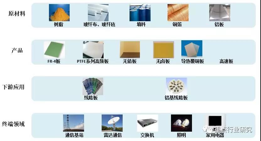 从CCL产业链可以看出,其上游原材料为铜箔、玻璃纤维布、树脂等材料。下游为PCB,终端产品则分布在集成电路各行各业,包括航空、航天、遥感、遥测、遥控、通讯、计算机、工业控制、家用电器、高级儿童玩具等电子产品。