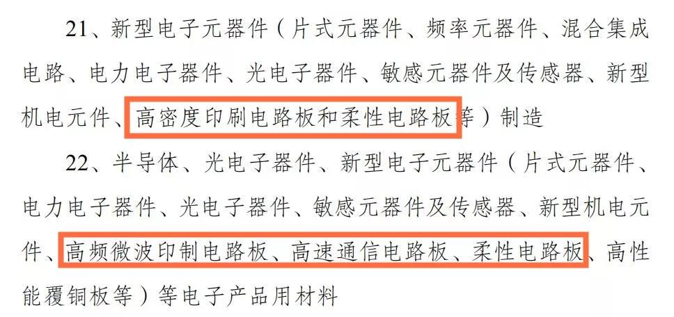 而在鼓励发展的第二十八类信息产业中,高密度印制电路板和柔性电路板、高频微波印制电路板、高速通信电路板、柔性电路板等赫然在列。
