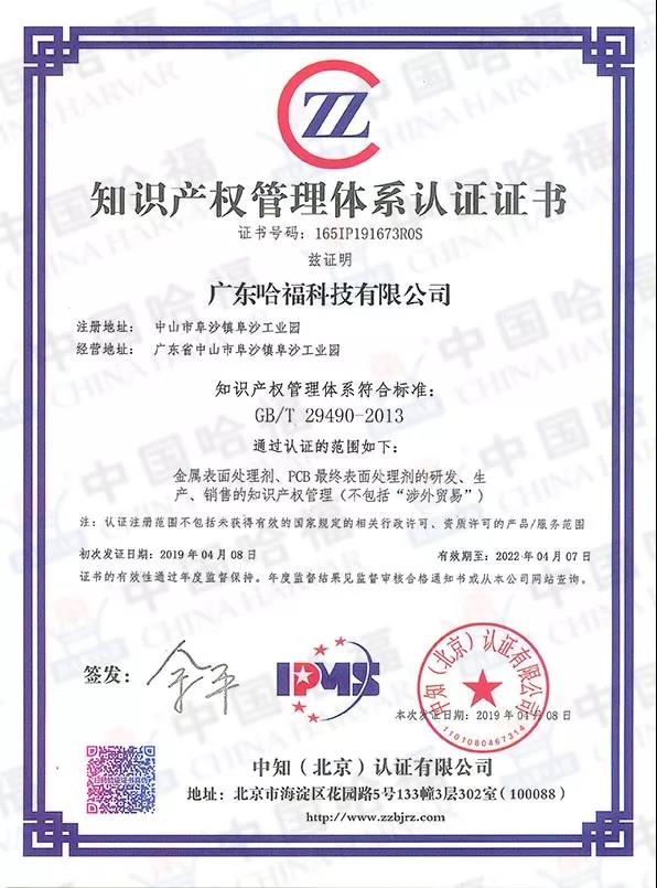 中国哈福集团凭借规范完善的知识产权管理体系,喜获国家《知识产权管理体系认证证书》,表明公司在知识产权管理方面达到国家标准,将有力地促进中国哈福在创新能力和核心竞争力建设,将中国哈福集团打造成为国内领先的PCB/FPC电子化学品专家,在科研创新领域创造更大价值。