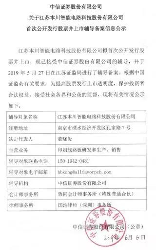 7月3日,原新三板公司本川智能发布公告,公司拟首次公开发行股票并上市,现已接受中信证券的辅导,并于2019年5月27日在江苏证监局进行了辅导备案。