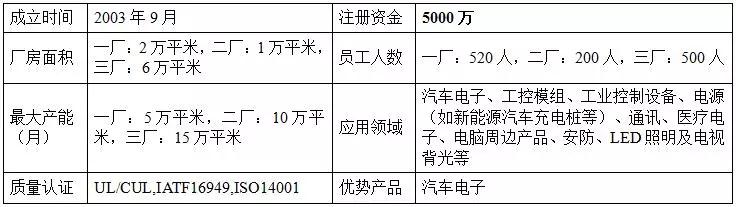 主要产品有1-12层硬性线路板,包括如特殊工艺的铝基板、铜基板和高频板。产品被广泛应用于汽车电子、工控模组、工业控制设备、电源(如新能源汽车充电桩等)、通讯、医疗电子、电脑周边产品、安防、LED照明及电视背光等。工厂拥有所有的表面处理生产线如沉金(电厚金)、金手指、喷锡(无铅)、OSP等,从开料到包装一条龙服务。