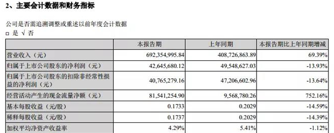 公司同日还公布了半年报,上半年实现营业总收入6.92亿元,同比增长69.39%;实现净利润4264.57万元,同比下降13.93%。