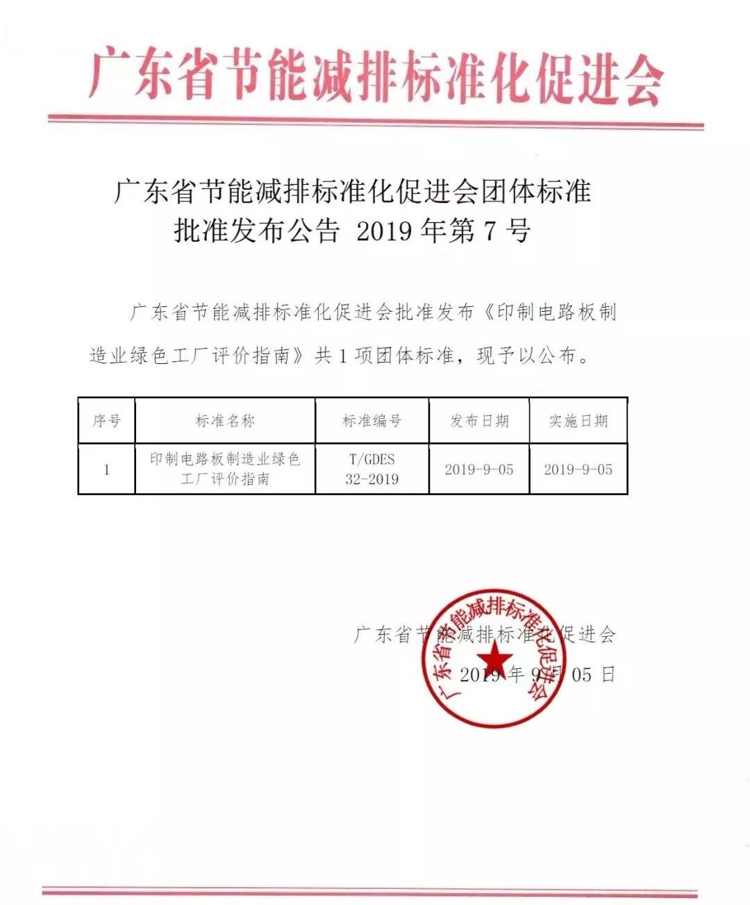 9月5日,广东省节能减排标准化促进会发布T/GDES 32—2019《印制电路板制造业绿色工厂评价指南》团体标准。该标准由工业和信息化部电子第五研究所、深圳市比亚迪电子部品件有限公司、广东财经大学、广东省节能减排标准化促进会、胜宏科技(惠州)股份有限公司、深圳市上达电子股份有限公司、深圳清华大学研究院共同起草。
