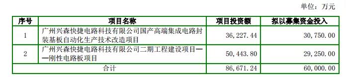 扣除发行费用后,3.075亿元用于广州兴森快捷电路科技有限公司国产高端集成电路封装基板自动化生产技术改造项目,2.925亿元用于广州兴森快捷电路科技有限公司二期工程建设项目——刚性电路板项目。