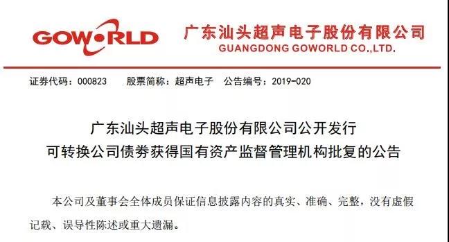 超声电子9月11日公告,公司收到汕头超声电子(集团)公司转来的汕头市人民政府国有资产监督管理委员会下发的《关于广东汕头超声 电子股份有限公司公开发行可转换公司债劵有关问题的批复》(汕国资[2019]120号),同意广东汕头超声电子股份有限公司公开发行可转换公司债券募集资金总额不超过7亿元(含7亿元),用于投资新型特种印制电路板产业化(一期)建设项目。