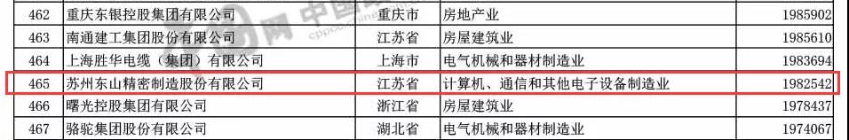 PCB行业中,苏州东山精密制造股份有限公司以198.2542亿元营收入围,位列第465名。