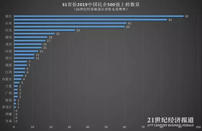 21世纪经济报道记者梳理发现,500家企业中,浙江、江苏、山东和广东四大经济强省显然是大赢家,分别拥有上榜企业92家、83家、61家和60家,4省合计共有296家企业,也就是说,占了这份榜单的半壁江山。