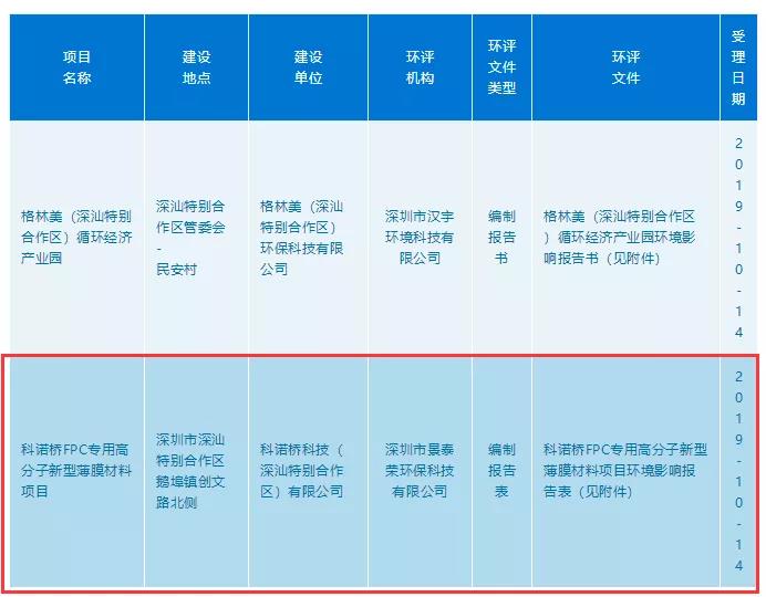 10月16日,深圳市生态环境局深汕管理局对2019年10月8日~2019年10月14日受理的2个建设项目环境影响评价文件予以公示。其中包含一个FPC材料项目:科诺桥FPC专用高分子新型薄膜材料项目。