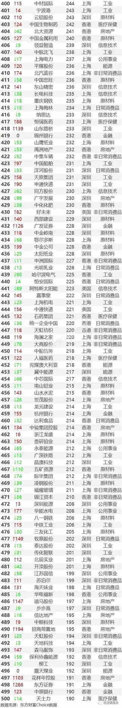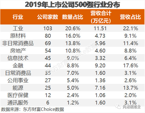 根据GICS行业,在500强公司中,来自工业行业的上市公司最多,共有103家,占比为20.60%;原材料行业同样为500强的高产行业,有80家。另外,非日常消费品、房地产、信息技术、金融等行业进入500强的企业数量也较多,分别68家、54家、45家、44家。