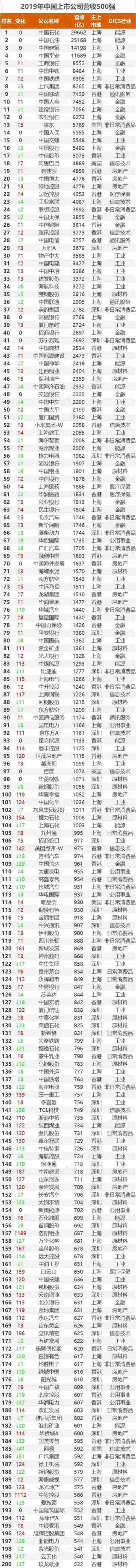 2019年中国上市公司营收500强榜单