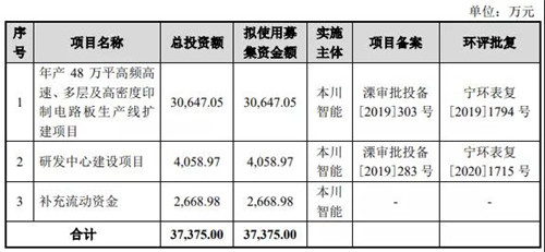 招股书显示,本川智能本次计划发行新股数量不超过1932.46万股,占发行后总股本的不低于25%,募资规模约为3.7375亿元人民币,主要用于年产48万平高频高速、多层及高密度印制电路板生产线扩建项目、研发中心建设项目及补充流动资金。