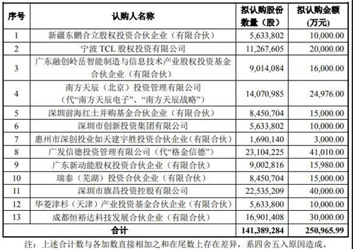 预案显示,胜宏科技本次定增的13名发行对象分别为东鹏投资、TCL投资、融创岭岳、南方天辰(代“南方天辰电子”、“南方天辰战略”)、红土基金、深创投、宇胜投资、广发信德(代“格金信德”)、广东新动能、旗昌投资、瑞泰投资、华菱投资、成都恒裕达。本次非公开发行股票的价格为17.75元/股。