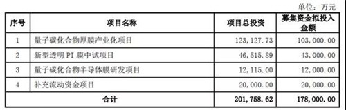 在丹邦科技四个拟募投项目中,投资额最大的即“量子碳化合物厚膜产业化项目”,投资额约12.31亿元,拟使用募集资金10.3亿元。