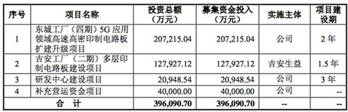 此次,生益电子拟发行不超过166,364,000股(含166,364,000股),募资39.61亿元,用于投建以下四大项目: