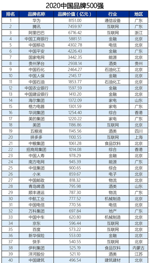 《2020中国品牌500强》的品牌评估范围:参与评估的品牌均为中国本土品牌(包含港澳台地区),烟草品牌由于其行业及社会影响所限,不在此次评选范围之中。