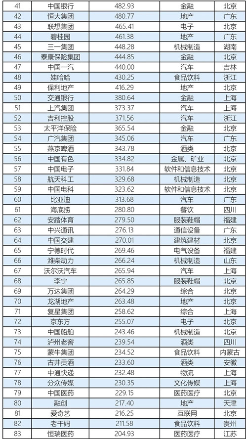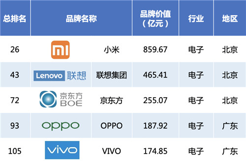 在《2020中国品牌500强》上榜品牌中,电子行业共有43个品牌上榜。其中,小米以859.67亿元的品牌价值位于总榜单第26位,成为品牌价值最高的电子企业。联想集团、京东方和OPPO分别以465.14亿元、255.07亿元和187.92亿元位列行业的2至4位。